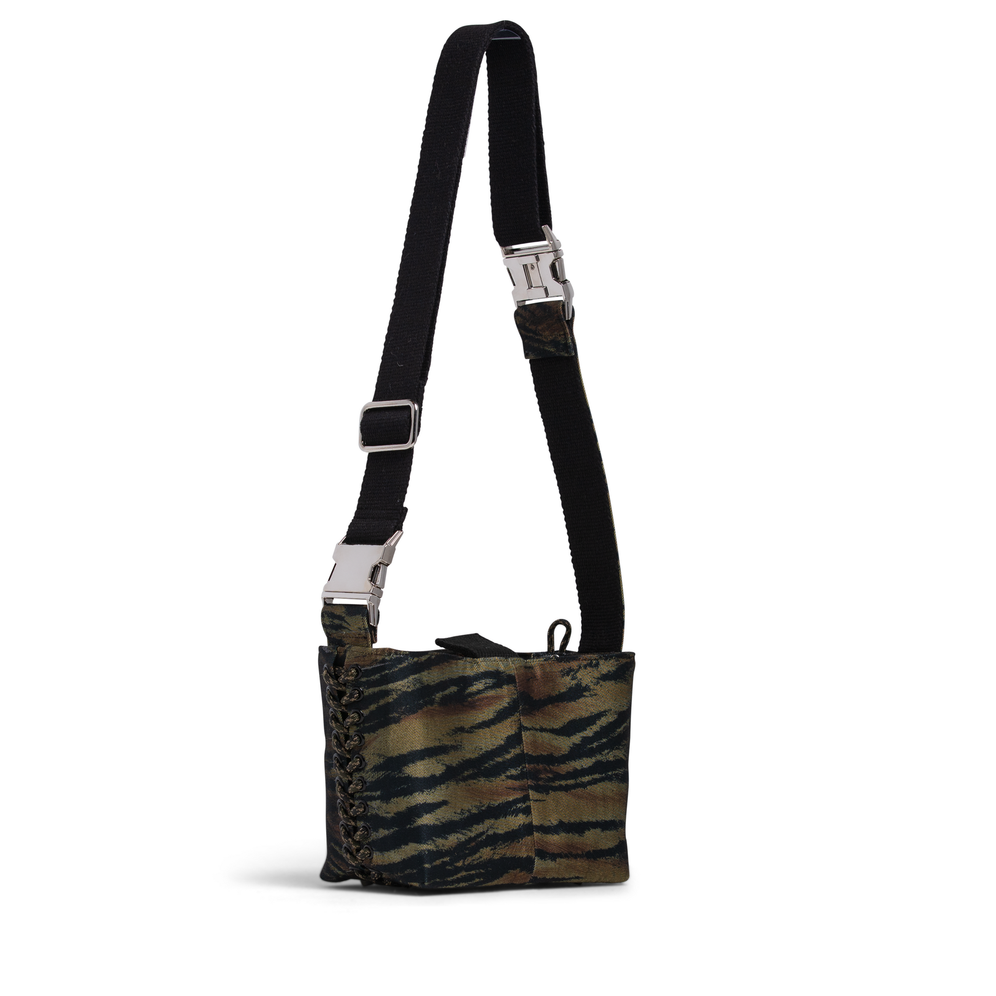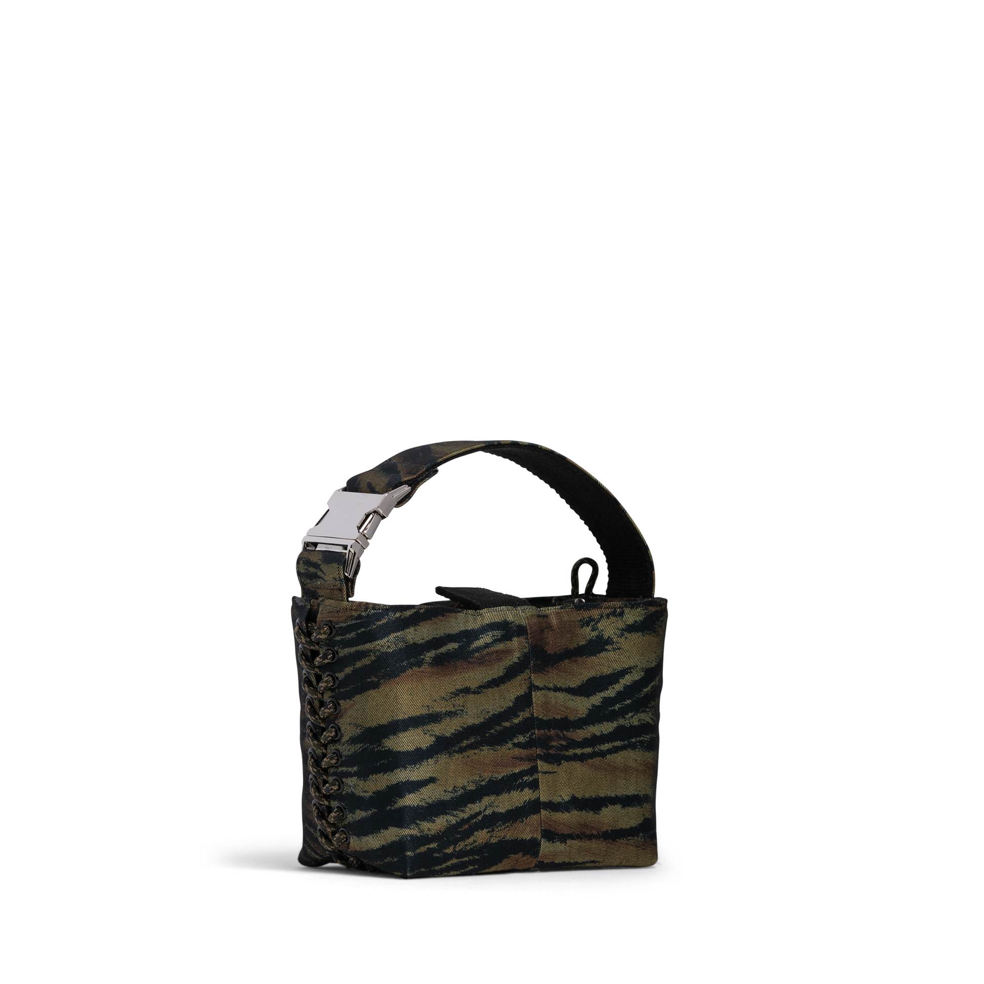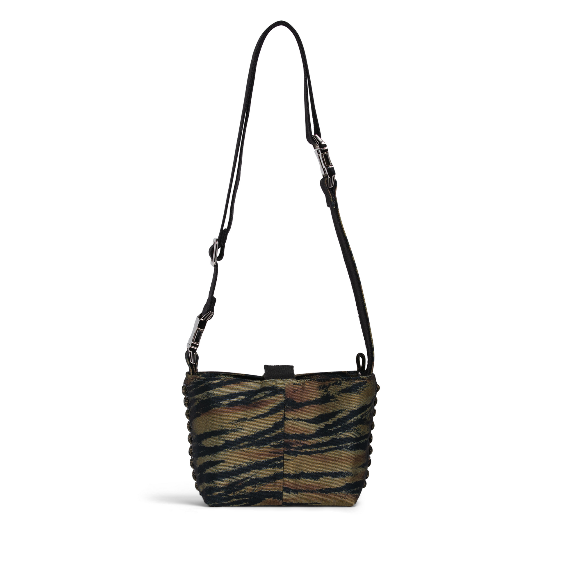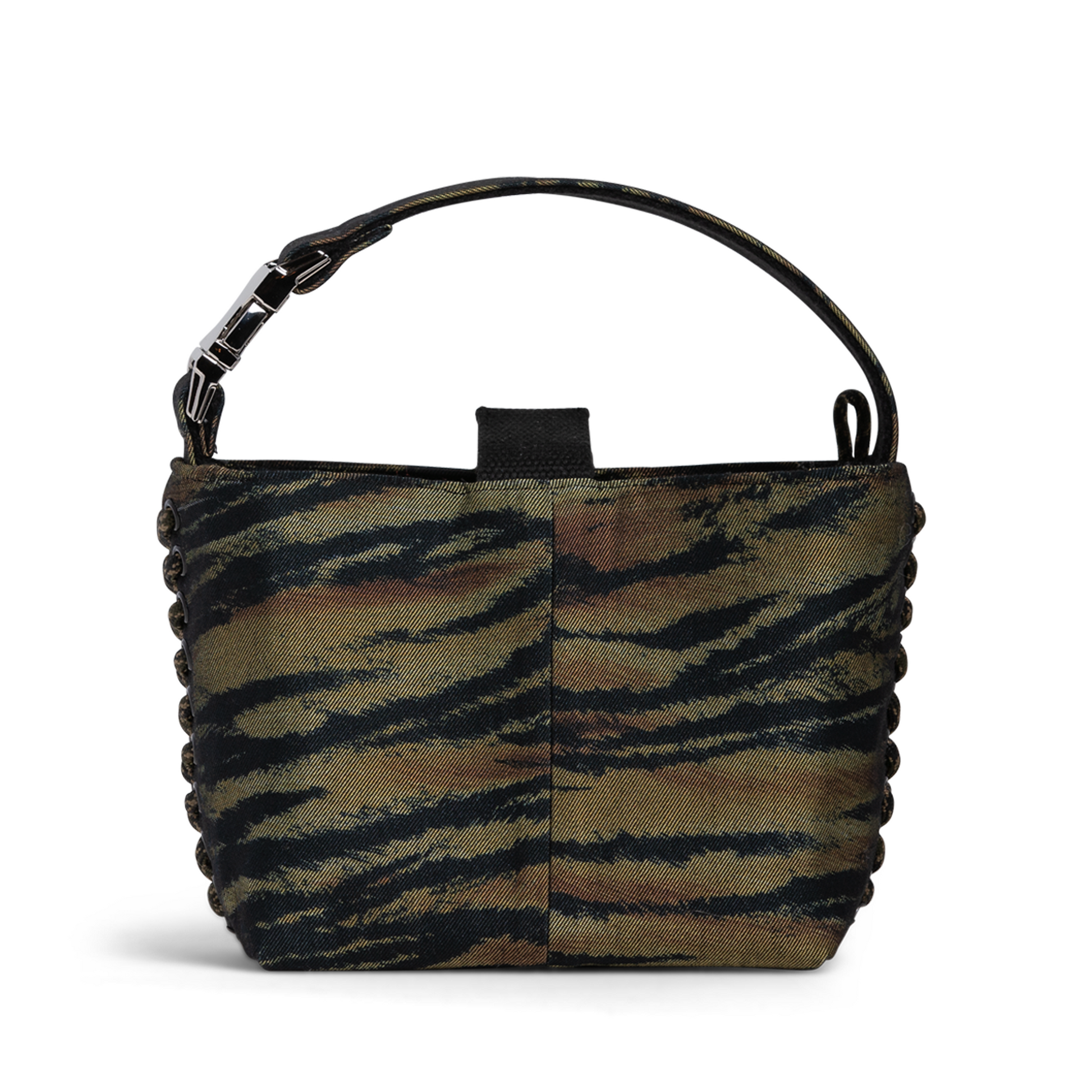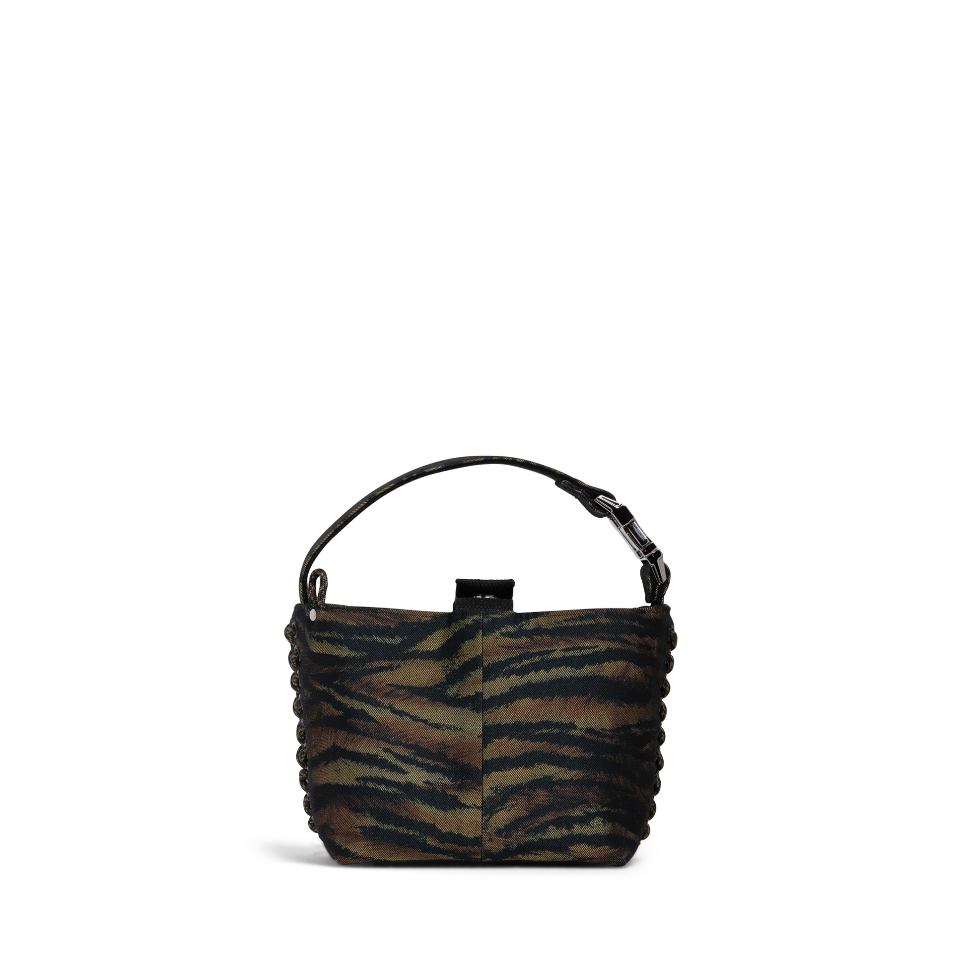 This one-off edition has a bold tiger stripe created from a vintage skirt, with vintage silk scarf lining & new silver hardware.
